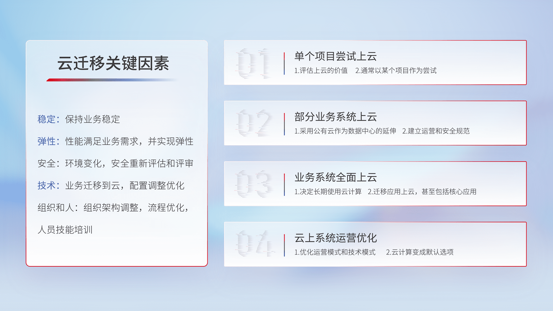 结合实际业务,,,从规划设计、、、云平台选型、、云原生改造、、、、数据迁移、、集成交付,,,,迁移全过程为客户识别最佳上云路径,,做好风险识别管理,,,设计网络架构、、、身份权限、、、、安全审计合规、、操作审计、、日志审计、、监控告警策略、、多站点容灾设计等,,,,对云上基础设施进行整体规划,,提升IT治理水平,,,,以满足弹性、、高可用、、、高性能的需求。。。。
