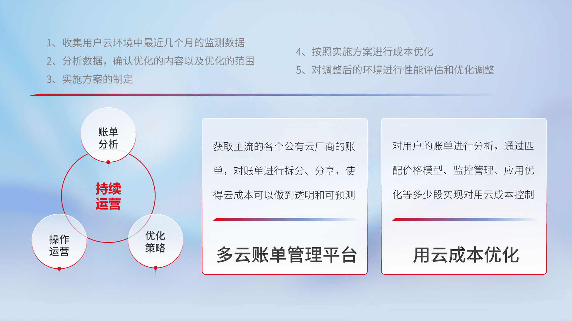 通过多云纳管,,以统一的资源数据模型把客户的云资源进行抽象和封装,,,进而实现对多云资源的统一操作,,,保障云资源管理的可靠性、、、稳定性与可用性。。量身定制化运维内容,,,,配置、、、、开发运维、、、、补丁管理、、、、备份、、监控、、、、认证和访问管理、、审计和日常巡检等,,,保障在用云过程中的可靠度,,稳定度以及高可用率。。。。
